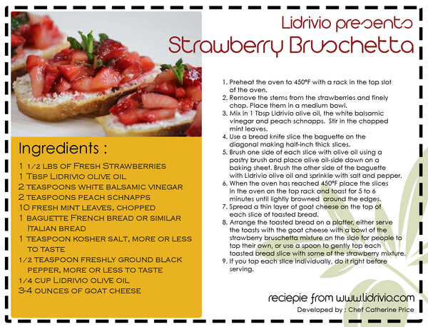 Mix in 1 Tbsp Lidrivio olive oil, the white balsamic vinegar and peach schnapps. Stir in the chopped mint leaves.